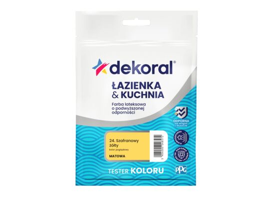 - >Farba lateksowa o podwyższonej odporności ŁAZIENKA & KUCHNIA TESTER Szafranowy żółty 0,03 l Dekoral