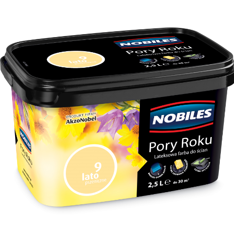 Farba lateksowa Pory Roku lato Pszeniczne 2,5 l NOBILES świetnie sprawdzi się podczas remontu i odświeżania koloru ścian. Produkt odznacza się doskonałym poziomem krycia i mikroporowatą strukturą, dzięki której ściany mogą swobodnie „oddychać”, a wilgoć nie kumuluje się wewnątrz murów budynku. Ponadto emulsja sprawia, że powierzchnia jest łatwa do utrzymania w czystości. Wystarczy wilgotna szmatka, aby usunąć wszelkie zabrudzenia.