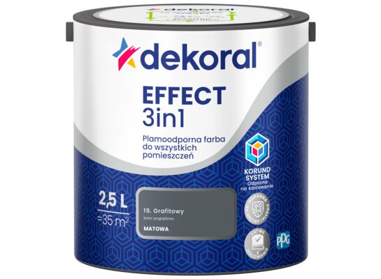 Dekoral EFFECT 3in1 to plamoodporna farba rekomendowana do malowania wszystkich pomieszczeń, jak salon, sypialnia, pokój dziecięcy, korytarz, kuchnia i łazienka. Dzięki zawartości twardych jak diament kryształów korundu, posiada doskonałą odporność na zmywanie i szorowanie - bez zacieków. Dlatego umożliwia miejscowe czyszczenie stref najbardziej narażonych na zabrudzenia, jak okolice kontaktów, korytarze, dolna strefa ściany. Matowe wykończenie pozwala zamaskować niewielkie niedoskonałości podłoża. Farba silnie kryje, doskonale się rozprowadza i nie chlapie, gwarantując łatwość malowania i znakomity efekt nawet dla początkujących. Powłoka farby jest odporna na grzyby i pleśnie, dzięki czemu nadaje się także do pomieszczeń o podwyższonej wilgotności. Dekoral EFFECT 3in1 to łatwy wybór, łatwe malowanie i łatwe utrzymanie ścian w czystości.