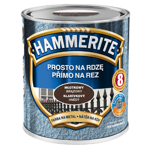 Farba Prosto Na Rdzę Brązowy Młotkowy 2,5 l Hammerite o optymalnej konsystencji jest przeznaczona do antykorozyjnego i dekoracyjnego malowania stali i żeliwa zarówno pokrytych rdzą, jak i czystych. Nie wymaga ona zastosowania podkładu, a dzięki technologii DUALTECH na malowanej powierzchni tworzy się powłoka, która zapewnia podwójną ochronę, odpychając wodę i zapobiegając powstawaniu rdzy. Produkt można stosować również w celu zabezpieczenia metali nieżelaznych po ich odpowiednim zagruntowaniu oraz wewnątrz pomieszczeń. Decydując się na tę farbę, stawiasz na 8 lat ochrony przed korozją.