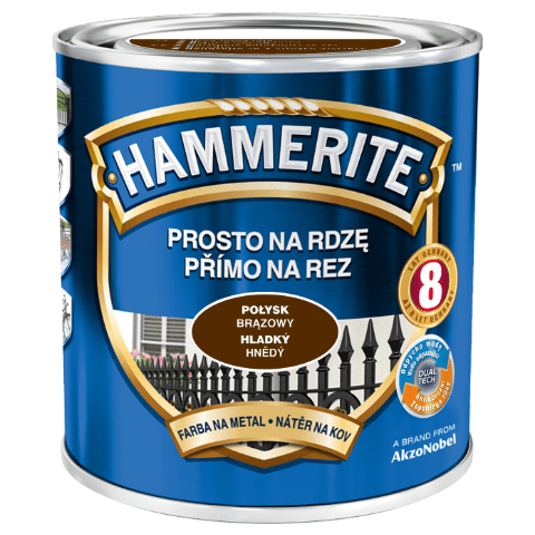 Farba Prosto Na Rdzę Brązowy Połysk 2,5 l Hammerite o optymalnej konsystencji jest przeznaczona do antykorozyjnego i dekoracyjnego malowania stali i żeliwa zarówno pokrytych rdzą, jak i czystych. Nie wymaga ona zastosowania podkładu, a dzięki technologii DUALTECH na malowanej powierzchni tworzy się powłoka, która zapewnia podwójną ochronę, odpychając wodę i zapobiegając powstawaniu rdzy. Produkt można stosować również w celu zabezpieczenia metali nieżelaznych po ich odpowiednim zagruntowaniu oraz wewnątrz pomieszczeń. Decydując się na tę farbę, stawiasz na 8 lat ochrony przed korozją.