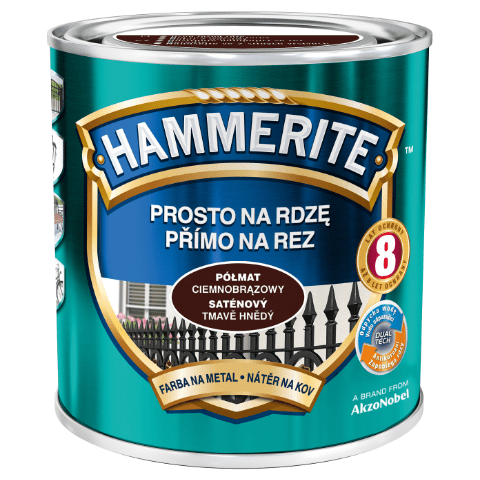 Farba Prosto Na Rdzę Ciemnobrązowy Półmat 0,25 l Hammerite to jednoskładnikowy produkt przeznaczony do antykorozyjnego oraz dekoracyjnego malowania stali czy żeliwa zarówno pokrytych rdzą, jak i tych czystych. Dzięki wysokiej konsystencji można nakładać na zabezpieczaną powierzchnię grube warstwy farby. Jej odpowiednia pigmentacja i wyselekcjonowane żywice natomiast zapewniają optymalną ochronę przed wpływem różnych warunków atmosferycznych oraz rdzy. Produkt nie wymaga podkładu, jego wydajność wynosi do 10 m² / l, a całkowity czas schnięcia to maksymalnie 8 h.