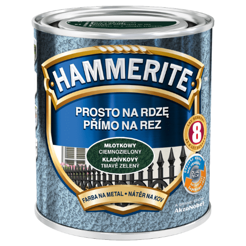 Farba Prosto Na Rdzę Ciemnozielony Młotkowy 0,25 l Hammerite to jednoskładnikowy produkt przeznaczony do antykorozyjnego oraz dekoracyjnego malowania stali czy żeliwa zarówno pokrytych rdzą, jak i tych czystych. Dzięki wysokiej konsystencji można nakładać na zabezpieczaną powierzchnię grube warstwy farby. Jej odpowiednia pigmentacja i wyselekcjonowane żywice natomiast zapewniają optymalną ochronę przed wpływem różnych warunków atmosferycznych oraz rdzy. Produkt nie wymaga podkładu, jego wydajność wynosi do 10 m² / l, a całkowity czas schnięcia to maksymalnie 8 h.