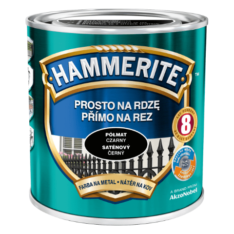 Farba Prosto Na Rdzę Czarny Półmat 0,7 l Hammerite jest przeznaczona do antykorozyjnego i dekoracyjnego malowania stali i żeliwa. Specjalnie dobrana kompozycja składników sprawia, że produkt wyróżnia się wysoką konsystencją, umożliwiającą nakładanie grubych warstw. Po aplikacji na powierzchni tworzy się bariera chroniąca przed wilgocią, która skutecznie zapobiega powstawaniu rdzy. Farba zapewnia zielony kolor o młotkowym wykończeniu. Jej wydajność wynosi do 10 m² / l, natomiast całkowity czas schnięcia to maksymalnie 8 h.