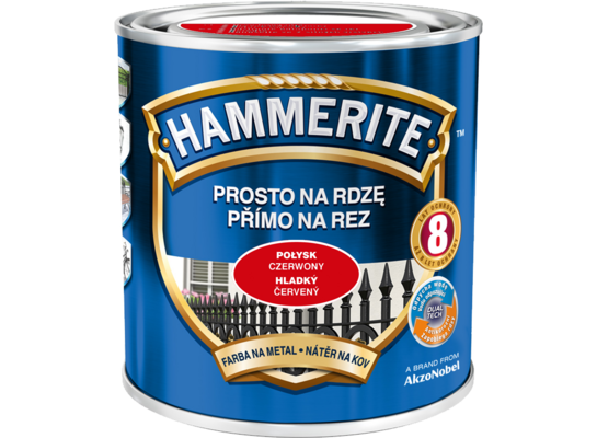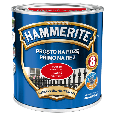 Farba Prosto Na Rdzę Czerwony Połysk 0,25 l Hammerite to jednoskładnikowy produkt przeznaczony do antykorozyjnego oraz dekoracyjnego malowania stali czy żeliwa zarówno pokrytych rdzą, jak i tych czystych. Dzięki wysokiej konsystencji można nakładać na zabezpieczaną powierzchnię grube warstwy farby. Jej odpowiednia pigmentacja i wyselekcjonowane żywice natomiast zapewniają optymalną ochronę przed wpływem różnych warunków atmosferycznych oraz rdzy. Produkt nie wymaga podkładu, jego wydajność wynosi do 10 m² / l, a całkowity czas schnięcia to maksymalnie 8 h.