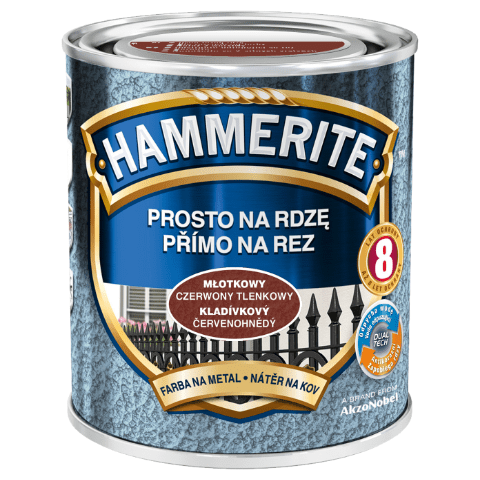 Farba Prosto Na Rdzę Czerwony Tlenkowy Młotkowy 0,25 l Hammerite to jednoskładnikowy produkt przeznaczony do antykorozyjnego oraz dekoracyjnego malowania stali czy żeliwa zarówno pokrytych rdzą, jak i tych czystych. Dzięki wysokiej konsystencji można nakładać na zabezpieczaną powierzchnię grube warstwy farby. Jej odpowiednia pigmentacja i wyselekcjonowane żywice natomiast zapewniają optymalną ochronę przed wpływem różnych warunków atmosferycznych oraz rdzy. Produkt nie wymaga podkładu, jego wydajność wynosi do 10 m² / l, a całkowity czas schnięcia to maksymalnie 8 h.