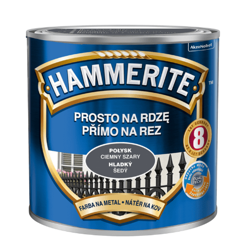 Farba Prosto Na Rdzę Ciemny Szary 0,25 l Hammerite to jednoskładnikowy produkt przeznaczony do antykorozyjnego oraz dekoracyjnego malowania stali czy żeliwa zarówno pokrytych rdzą, jak i tych czystych. Dzięki wysokiej konsystencji można nakładać na zabezpieczaną powierzchnię grube warstwy farby. Jej odpowiednia pigmentacja i wyselekcjonowane żywice natomiast zapewniają optymalną ochronę przed wpływem różnych warunków atmosferycznych oraz rdzy. Produkt nie wymaga podkładu, jego wydajność wynosi do 10 m² / l, a całkowity czas schnięcia to maksymalnie 8 h.