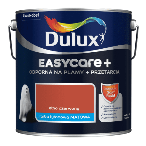 Farba tytanowa Dulux EasyCare+ Plamy+Przetarcia Etno Czerwony 2,5 l o matowym wykończeniu jest odporna na plamy i szorowanie. Technologia Scuff Resist sprawia, że po nałożeniu na powierzchni tworzą się trwałe powłoki ograniczające tarcie w trakcie uderzenia lub przesuwania przedmiotami z gumy, plastiku lub drewna. Emulsja najlepiej sprawdzi się w pomieszczeniach o dużym natężeniu ruchu, np. korytarzu, przedpokoju, pomieszczeniach biurowych lub miejscach publicznych. Ze względu na optymalny czas schnięcia farba sprawia, że malowanie przebiega szybko i sprawnie.
