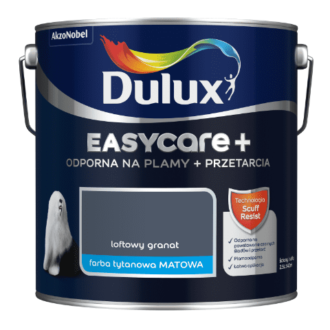Farba tytanowa Dulux EasyCare+ Plamy+Przetarcia Loftowy Granat 2,5 l o matowym wykończeniu jest odporna na plamy i szorowanie. Technologia Scuff Resist sprawia, że po nałożeniu na powierzchni tworzą się trwałe powłoki ograniczające tarcie w trakcie uderzenia lub przesuwania przedmiotami z gumy, plastiku lub drewna. Emulsja najlepiej sprawdzi się w pomieszczeniach o dużym natężeniu ruchu, np. korytarzu, przedpokoju, pomieszczeniach biurowych lub miejscach publicznych. Ze względu na optymalny czas schnięcia farba sprawia, że malowanie przebiega szybko i sprawnie.