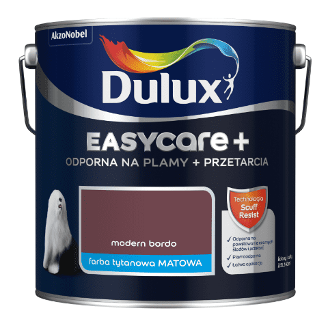 Farba tytanowa Dulux EasyCare+ Plamy+Przetarcia Modern Bordo 2,5 l o matowym wykończeniu jest odporna na plamy i szorowanie. Technologia Scuff Resist sprawia, że po nałożeniu na powierzchni tworzą się trwałe powłoki ograniczające tarcie w trakcie uderzenia lub przesuwania przedmiotami z gumy, plastiku lub drewna. Emulsja najlepiej sprawdzi się w pomieszczeniach o dużym natężeniu ruchu, np. korytarzu, przedpokoju, pomieszczeniach biurowych lub miejscach publicznych. Ze względu na optymalny czas schnięcia farba sprawia, że malowanie przebiega szybko i sprawnie.