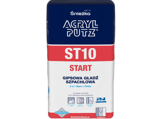 ACRYL-PUTZ® ST10 START jest sypką gładzią szpachlową na bazie gipsu naturalnego, wypełniaczy mineralnych i środków modyfikujących doskonale przyczepną do podłoży. Nie wykazuje skurczu, wysycha w krótkim czasie, nie pęka nawet w grubych warstwach (do 3cm przy pojedynczych ubytkach) i łatwo się szlifuje. Zarobioną gładź można nakładać "mokro na mokro" tj. kolejną warstwę przed pełnym wyschnięciem poprzedniej co znacznie skraca czas pracy. Ściany i sufity po zastosowaniu gładzi szpachlowej uzys
