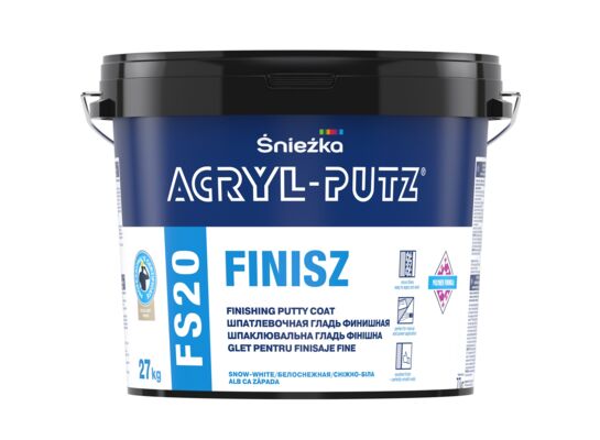 ACRYL-PUTZ® FS20 FINISZ to gotowa gładź szpachlowa najwyższej jakości polecana do ostatecznego, wykończeniowego wygładzania powierzchni ścian i sufitów. Może być nakładana metodą ręczna lub maszynową. W czasie stosowania zachowuje stałą konsystencję, dzięki czemu może być używana przez długi okres czasu. Niezużyta, szczelnie zamknięta zachowuje przydatność do dalszego stosowania. Po wyschnięciu wyjątkowo łatwo się szlifuje zachowując bardzo dobre parametry wytrzymałościowe. Ściany i sufity po za