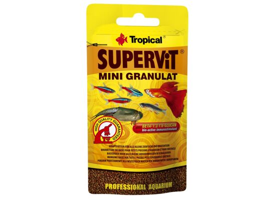 SUPERVIT MINI GRANULAT wieloskładnikowy pokarm w formie minigranulatu z beta-glukanem. SUPERVIT MINI GRANULAT to uniwersalny pokarm w formie drobnego, tonącego granulatu do codziennego karmienia małych ryb akwariowych, dorastającego narybku, krewetek karłowatych oraz przekopnic. Potrzeby żywieniowe i energetyczne ryb zabezpiecza niezwykle bogata receptura, na którą składa się kilkadziesiąt wyselekcjonowanych składników najwyższej jakości, w tym skorupiaki, mięczaki i glony. Układ immunologiczny