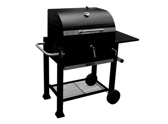 - Akcesoria dodatkowewykonanie z lakierowanej blachy stalowej; korpus urządzenia w kolorze czarnym pokryty lakierem proszkowym; dzielony, emaliowany ruszt grillowy; chromowany ruszt do podgrzewania o dużej powierzchni; lakierowana perforowana blacha paleniskowa z płynną regulacją wysokości przy pomocy dźwigni; wyciągana szuflada na popiół; przesłona wentylacyjna w pokrywie (x2) i misce paleniskowe (x2); wskaźnik temperatury w pokrywie; uchwyt pokrywy i szuflady na popiół ze stali szlachetnej; stabilne składane półki boczne z metalu z wieszakiem na akcesoria (x2); druciana półka dolna; zamykana klapa paleniskowa umożliwiająca łatwy i wygodny dostęp do miski paleniskowej; podstawa jezdna z dwoma kołami odpornymi na warunki atmosferyczne; sterowanie temperaturą grillowania za pomocą płynnej regulacji wysokości paleniska; duża powierzchnia grillowania 48 x 71 cm - odpowiedni dla około 14 osób