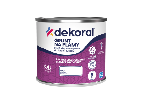 GRUNT NA PLAMY przeznaczony do pokrywania plam po zaciekach wodnych, sadzy nikotynie, tłuszczach oraz innych produktach spożywczych. Ma charakter farby podkładowej izolującej plamy i wzmacniającej podłoże przed aplikacją farb wewnętrznych do ścian i sufitów. Długotrwale zabezpiecza powłokę farby przed rozwojem grzybów pleśniowych w pomieszczeniach narażonych na działanie wilgoci, tj. łazienki, kuchnie, piwnice, pływalnie, browary, piekarnie, pralnie itp. Nie chroni tynku przed rozwojem mikroorganizmów.