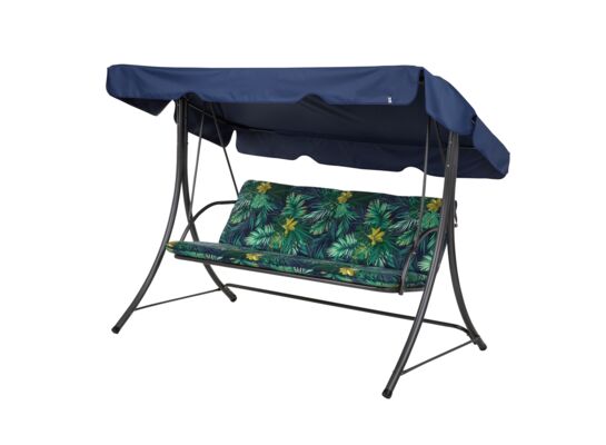 Huśtawka ogrodowa. Wymiar stelaża (szer. x gł. x wys.) 199 x 117 x 155 cm. Wymiar siedziska 150 x 50 x 50 cm. Konstrukcja z rur stalowych o grubości Ø 42 x 1,2 mm malowanych proszkowo. Siedzisko - sprężyny. W komplecie poduszka 2-częściowa pikowana/w przeszycia, o wymiarach: oparcie 150 x 48 x 6 cm oraz siedzisko 150 x 53 x 6 cm. Wierzch oraz spód poduszki wykonany z takniny. W części oparciowej troczki do mocowania. Dach z tkaniny poloiestrowej. Maksymalne obciążenie 250 kg. PRODUKCJA POLSKA - DAJAR.