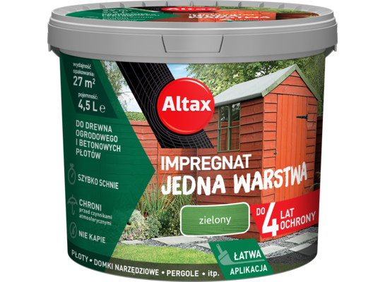 Altax Impregnat Jedna Warstwa 4 lata to niezawodny preparat do ochrony elementów architektury ogrodowej, wykonanej z drewna ogrodowego i betonu. Dzięki specjalnej formulacji już jedna warstwa wystarczy, aby skutecznie zabezpieczyć powierzchnię przed czynnikami atmosferycznymi do 4 lat. Produkt bazuje na systemie wosków, który zapewnia niełuszczącą się, elastyczną powłokę, która pozostaje w świetnej formie na długo. Szybkoschnąca formulacja pozwala na renowację elementów architektury ogrodowej w jeden dzień.