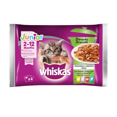 - >Karma dla kotów Junior pełnoporcjowa potrawka w galaretce smaki rybne i tradycyjne 340 g (4 x 85 g) Whiskas