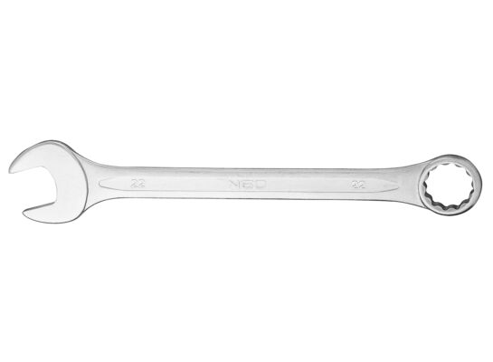 Klucz płasko - oczkowy NEO (numer referencyjny 09 - 722) o wymiarze 22 x 260 mm, wykonany zgodnie z normą DIN 3113. Wysokogatunkowa stal chromowo - wanadowa zapewnia długoletnią wytrzymałość klucza. Jakość narzędzia potwierdzona certyfikatem TÜV i 25 - letnią gwarancją producenta. Marka NEO spełnia oczekiwania profesjonalistów.
