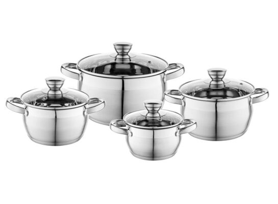 Komplet garnków o pojemnościach 1,3 l, 1,8 l, 2,5 l i 3,4 l celująco zda egzamin w każdej domowej kuchni. Garnki zostały wykonane z wysokiej jakości stali nierdzewnej, dzięki czemu są wysoce odporne na uszkodzenia oraz regularną eksploatację. Dodatkową zaletą są przezroczyste pokrywki dołączone do kompletu. Dzięki nim masz możliwość stałej kontroli procesu gotowania. Garnki można używać na dowolnej kuchence (również indukcyjnej) oraz myć w zmywarce.