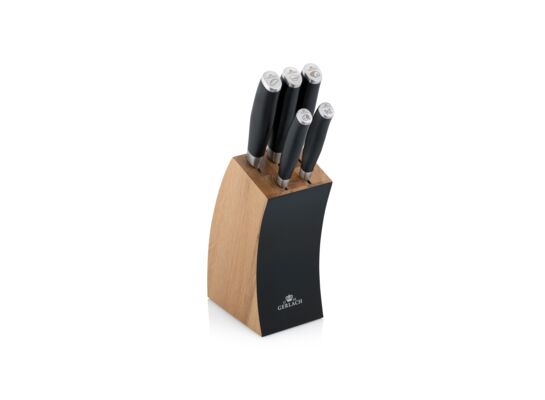 - >Komplet 5 czarnych noży kuchennych w bloku dębowym Deco Black Gerlach