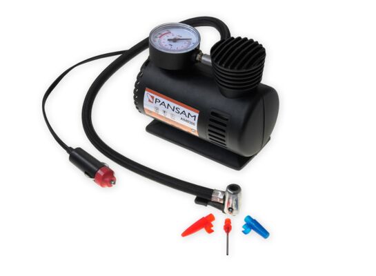 Mini kompresor samochodowy. Napięcie pracy 12 V, wtyczka samochodowa. W zestawie uniwersalne końcówki do pompowania.