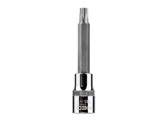 Końcówka Torx na nasadce 1/2" NEO (numer referencyjny 08 - 765) o rozmiarze T45, długości 100 mm. Nasadka wykonana z wytrzymałej stali chromowo - wanadowej. Końcówka sześciokątna z wysokogatunkowej stali stopowej S2. Jakość narzędzia potwierdzona certyfikatem TÜV i 25 - letnią gwarancją producenta. Marka NEO spełnia oczekiwania profesjonalistów.
