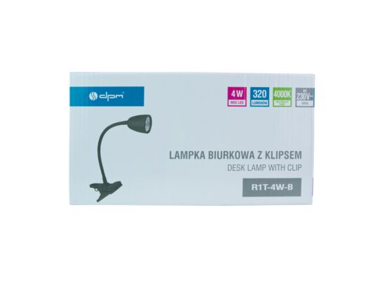 Lampka biurkowa LED z klipsem. Moc: 4 W. Strumień świetlny: 420 lm. Barwa światła: 4000 K (neutralny biały). Zasilanie: AC 220-240 V~. Długość przewodu: 150 cm. Elastyczne ramię. Włącznik ON/OFF. Stopień ochrony: IP20. Średnica klosza: 62 mm. Klasa energetyczna: F. Wymiary: 437 x 115 x 62 mm. Kolor: biały. Opakowanie: karton
