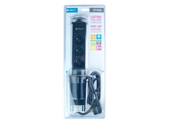 Listwa zasilająca podblatowa wysuwana. 3 gniazda z uziemieniem 2P+Z. Max. 16 A (3680 W). Długość przewodu: 1,4 m. Otwór montażowy: 7 cm. Opakowanie: blister