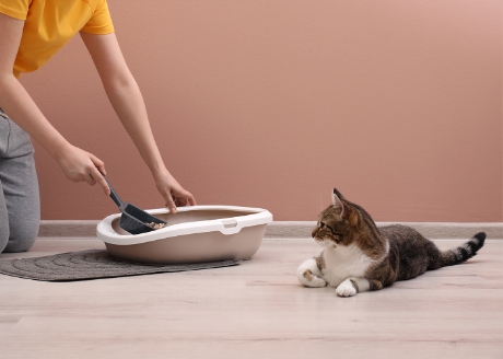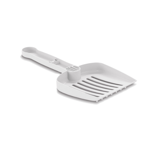 Małe otwory w łopatce przepuszczają niezużyty żwirek z powrotem do kuwety.