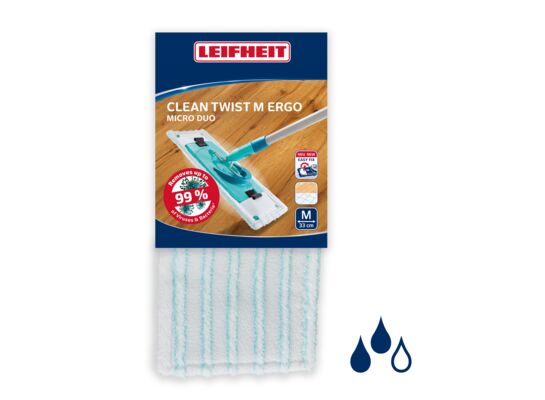 Nakładka micro duo do mopa Clean Twist M Ergo przeznaczona jest do czyszczenia wszystkich typów podłóg. To doskonały wybór w przypadku mieszanych powierzchni w domu czy mieszkaniu, ponieważ umożliwia umycie podłóg we wszystkich pomieszczeniach bez konieczności wymiany nakładki. Nakładka micro duo wykonana jest z dwóch rodzajów włókien. Dłuższe, bardziej sztywne, doskonale usuwają wszelkie zabrudzenia bez ryzyka uszkodzenia czy zarysowania delikatnych powierzchni, a miękkie, krótsze, zbierają wodę wraz z brudem. Nakładkę można prać w pralce w temperaturze 60°C.
