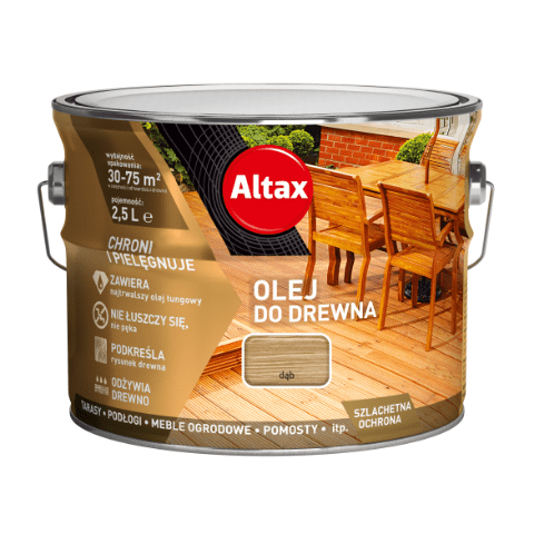 Olej do drewna 2,5 l dąb Altax pozwala osiągnąć satynowe wykończenie na malowanej powierzchni i nadaje się do tarasów, podłóg, pomostów oraz mebli ogrodowych. Wydajność oleju to 14-34 m²/l. Produkt należy nanosić za pomocą pędzla lub bawełnianej szmatki, a jego rozcieńczalnikiem jest benzyna lakowa. Czas schnięcia w dotyku oraz całkowity czas schnięcia wynoszą 24 h. Pokryta olejem powierzchnia jest chroniona przez rok. Produkt zawiera olej tungowy, który jest najtrwalszym olejem naturalnym i skutecznie zabezpiecza powierzchnie przed czynnikami atmosferycznymi, takimi jak woda, wilgoć, promieniowanie UV czy śnieg, podkreśla kolor i rysunek drewna, nie ulega łuszczeniu i pękaniu, a przeprowadzana za jego pomocą renowacja jest prosta i nie zajmuje wiele czasu. Olej bardzo szybko wnika w strukturę drewna, przez co idealnie je zabezpiecza, a po roku w naturalny sposób ulega wypłukaniu, dzięki czemu odnawianej powierzchni nie trzeba specjalnie szlifować czy przygotowywać.