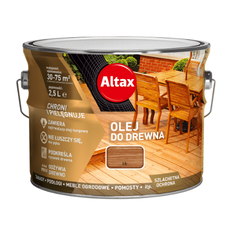 Olej do drewna 2,5 l tik Altax pozwala osiągnąć satynowe wykończenie na malowanej powierzchni i nadaje się do tarasów, podłóg, pomostów oraz mebli ogrodowych. Wydajność oleju to 14-34 m²/l. Produkt należy nanosić za pomocą pędzla lub bawełnianej szmatki, a jego rozcieńczalnikiem jest benzyna lakowa. Czas schnięcia w dotyku oraz całkowity czas schnięcia wynoszą 24 h. Pokryta olejem powierzchnia jest chroniona przez rok. Produkt zawiera olej tungowy, który jest najtrwalszym olejem naturalnym i skutecznie zabezpiecza powierzchnie przed czynnikami atmosferycznymi, takimi jak woda, wilgoć, promieniowanie UV czy śnieg, podkreśla kolor i rysunek drewna, nie ulega łuszczeniu i pękaniu, a przeprowadzana za jego pomocą renowacja jest prosta i nie zajmuje wiele czasu. Olej bardzo szybko wnika w strukturę drewna, przez co idealnie je zabezpiecza, a po roku w naturalny sposób ulega wypłukaniu, dzięki czemu odnawianej powierzchni nie trzeba specjalnie szlifować czy przygotowywać.