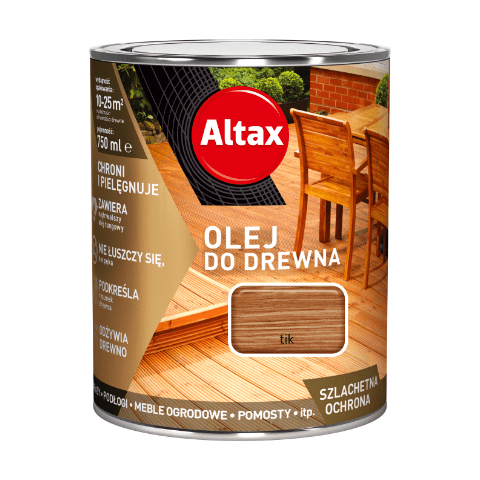 Olej do drewna 750 ml tik Altax daje satynowe i niezwykle naturalne wykończenie na malowanym drewnie. Przeznaczony jest szczególnie do tarasów, podłóg, pomostów oraz mebli ogrodowych, w których powierzchnię głęboko wnika, zabezpieczając ją przed zmiennymi warunkami pogodowymi. Zawarcie w składzie oleju tungowego, czyli najtrwalszego oleju naturalnego, wpływa na piękny kolor drewna, łatwość renowacji i brak łuszczenia się czy pękania warstwy ochronnej. Wydajność oleju wynosi 14-34 m²/l. Należy nanosić go za pomocą pędzla lub bawełnianej szmatki, a jako rozcieńczalnik stosować benzynę lakową. Czas schnięcia w dotyku oraz całkowity czas schnięcia wynoszą 24 h. Pomalowana powierzchnia jest chroniona przez rok, a po tym czasie olej ulega naturalnemu wypłukaniu, dlatego przed nakładaniem świeżej warstwy nie ma konieczności żmudnego przygotowywania czy szlifowania powierzchni.