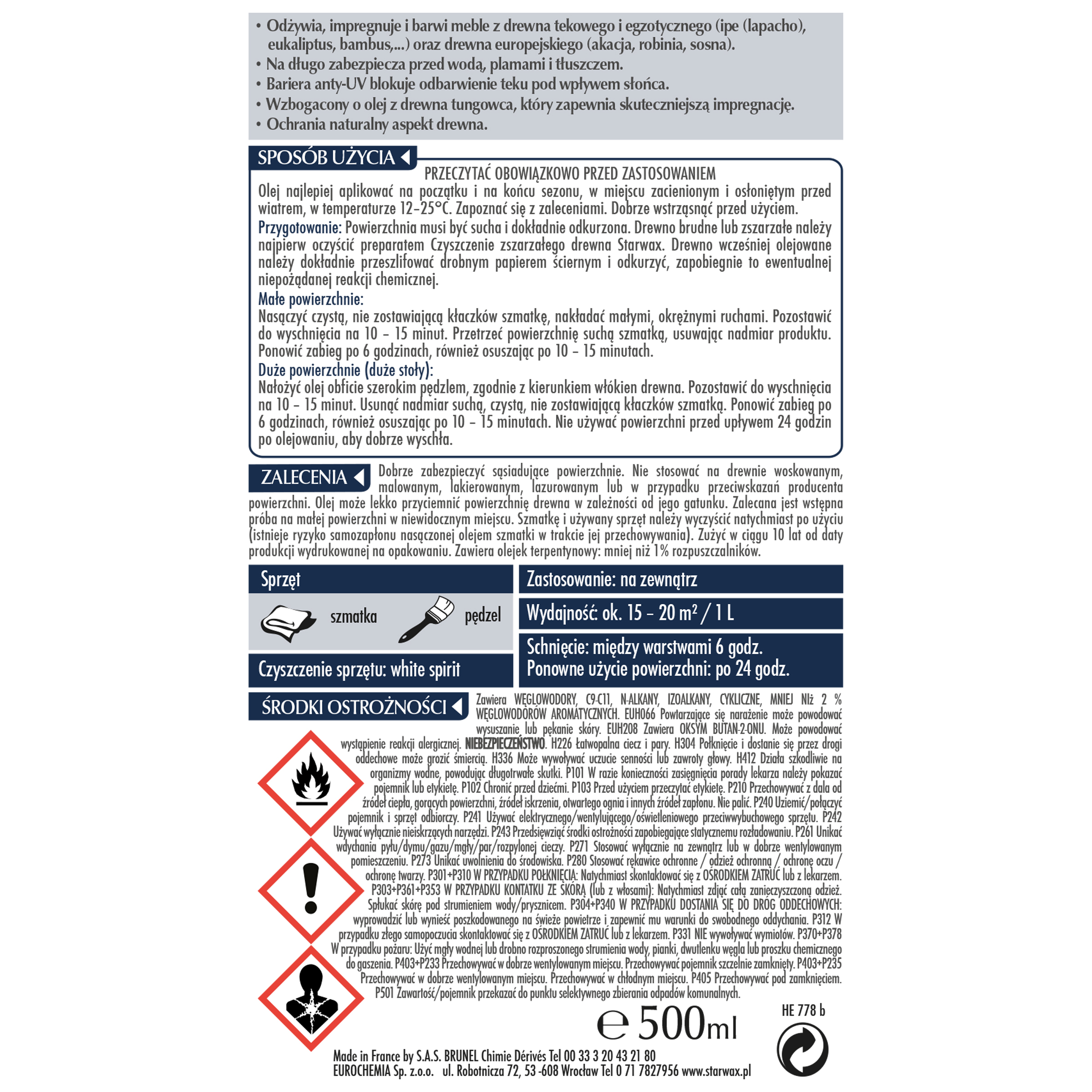 Olej 2 w 1 impregnuje i barwi drewno surowe lub wcześniej olejowane. Zapobiega wnikaniu wody, tłuszczu, napojów, dzięki zawartości filtru UV nie blaknie pod wpływem słońca. Podkreśla urodę rysunku włókien drewna.