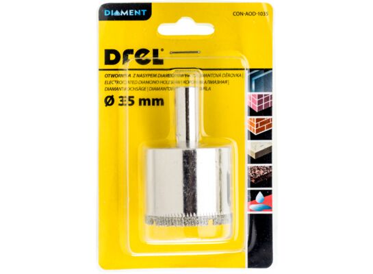 Otwornica z nasypem diamentowym 35 mm Drel jest produktem, którego korpus i trzpień zostały wykonane z wysokiej jakości stali narzędziowej. Zastosowany materiał zapewnia wysoką trwałość oraz odporność na uszkodzenia mechaniczne, co gwarantuje długą żywotność. Na górnej krawędzi roboczej znajduje się nasyp z syntetycznego diamentu o praktycznej szerokości przymocowany do stali specjalnym spoiwem.
