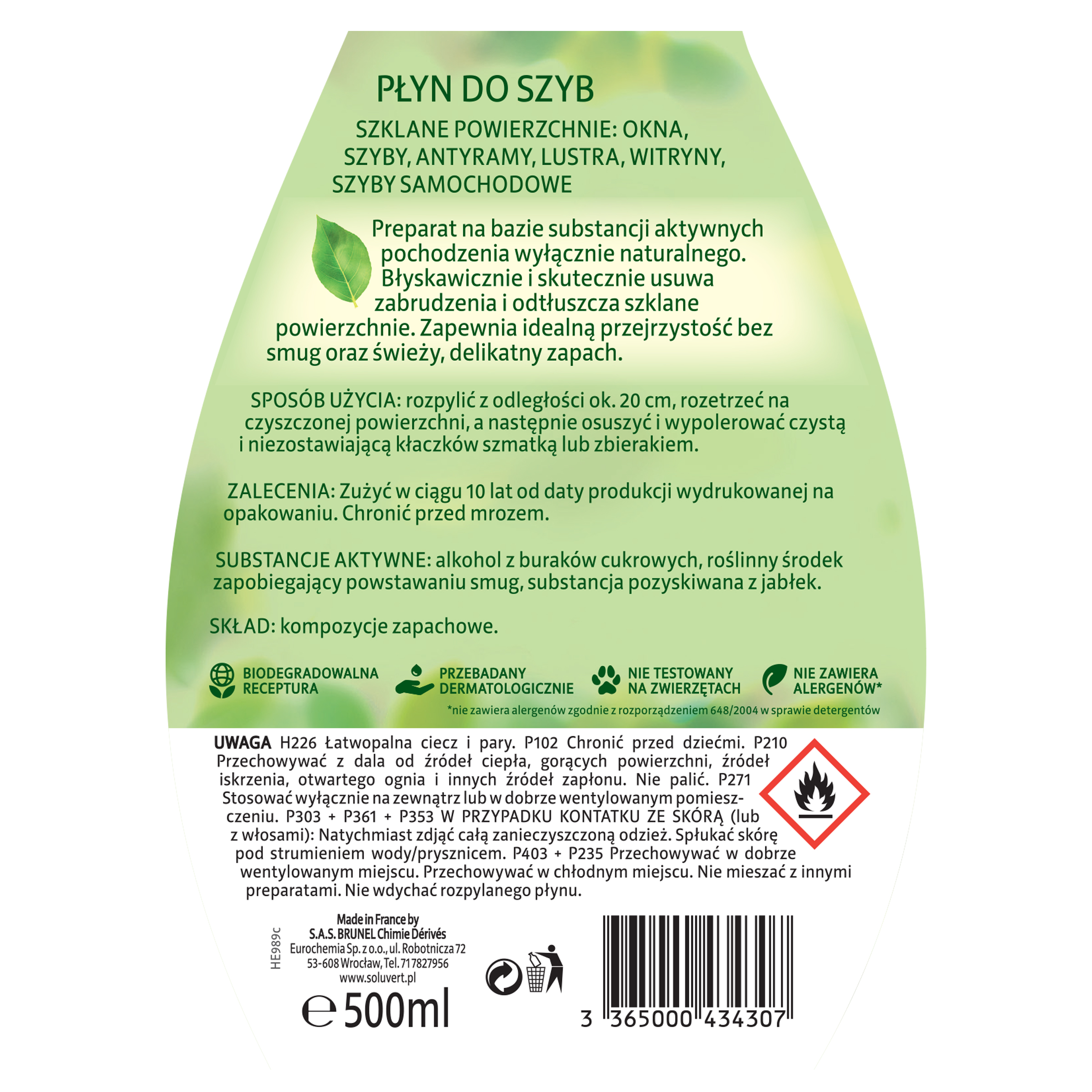 Płyn do szyb na bazie alkoholu z buraków cukrowych. Myje, odtłuszcza, nabłyszcza. Do szyb, luster, powierzchni szkliwionych, szklanych i kryształowych żyrandoli.