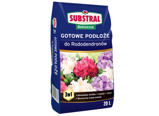 Substral Osmocote to gotowe podłoże do rododendronów zawierające bazową dawkę nawozu. Ziemia do kwiatów będąca mieszanką torfu niskiego i wysokiego dodatkowo wzbogacona jest składnikami poprawiającym strukturę podłoża keramzytem lub krzemionką czy glinką. Podłoże utrzymuje powietrze i wodę.