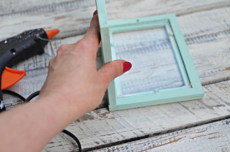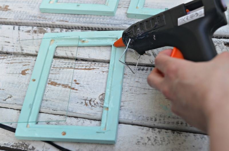 Po wyschnięciu, do pomalowanych (i polakierowanych) ramek przyklejamy wymyte i wysuszone szybki. Używamy do tego kleju na gorąco. Szybę przyklejamy w rogach i mocno dociskamy.