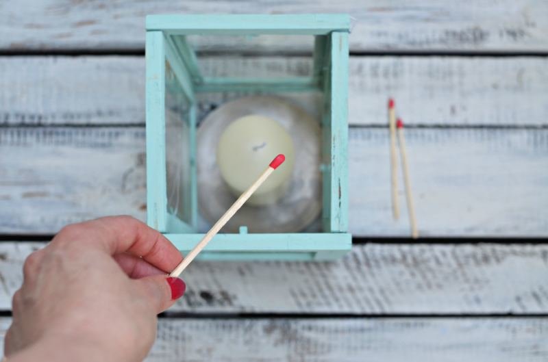 Kiedy osłona jest gotowa, wkładamy do środka świecę. Możesz ją postawić na talerzyku, podstawce na świece, tak aby lampion stabilnie przy tym stał. Nie stawiaj świec na łatwopalnych powierzchniach typu karton czy drewno.