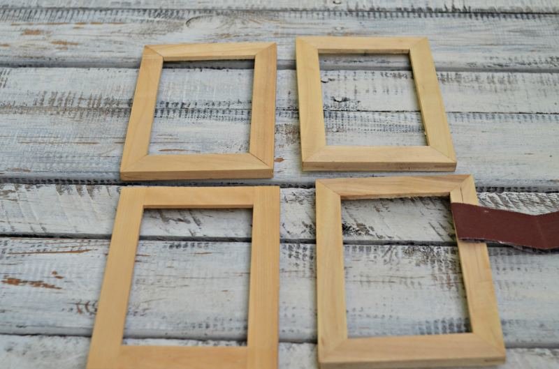 Drewniane ramki trzeba zmatowić, wtedy farba będzie lepiej przylegać do powierzchni. Wystarczy kilka razy przetrzeć je papierem ściernym ze wszystkich stron, a potem strzepać pył.