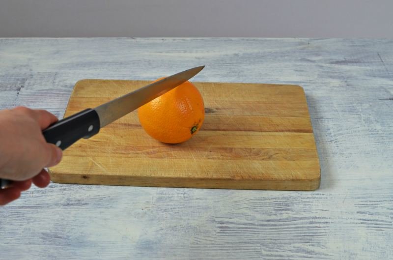 Pomarańcze kroimy na pół, wydrążamy z nich miąższ. Staraj się nie naruszyć skórki.
