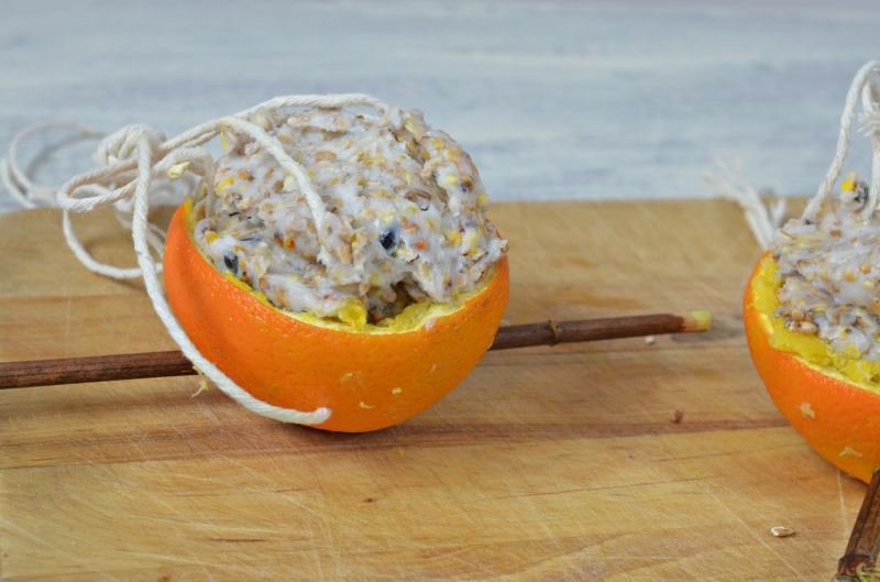 W pomarańczową skórkę wbijamy na wylot patyk. Zostawiamy go z dwóch stron aby ptak miał na czym przysiąść, podczas jedzenia.