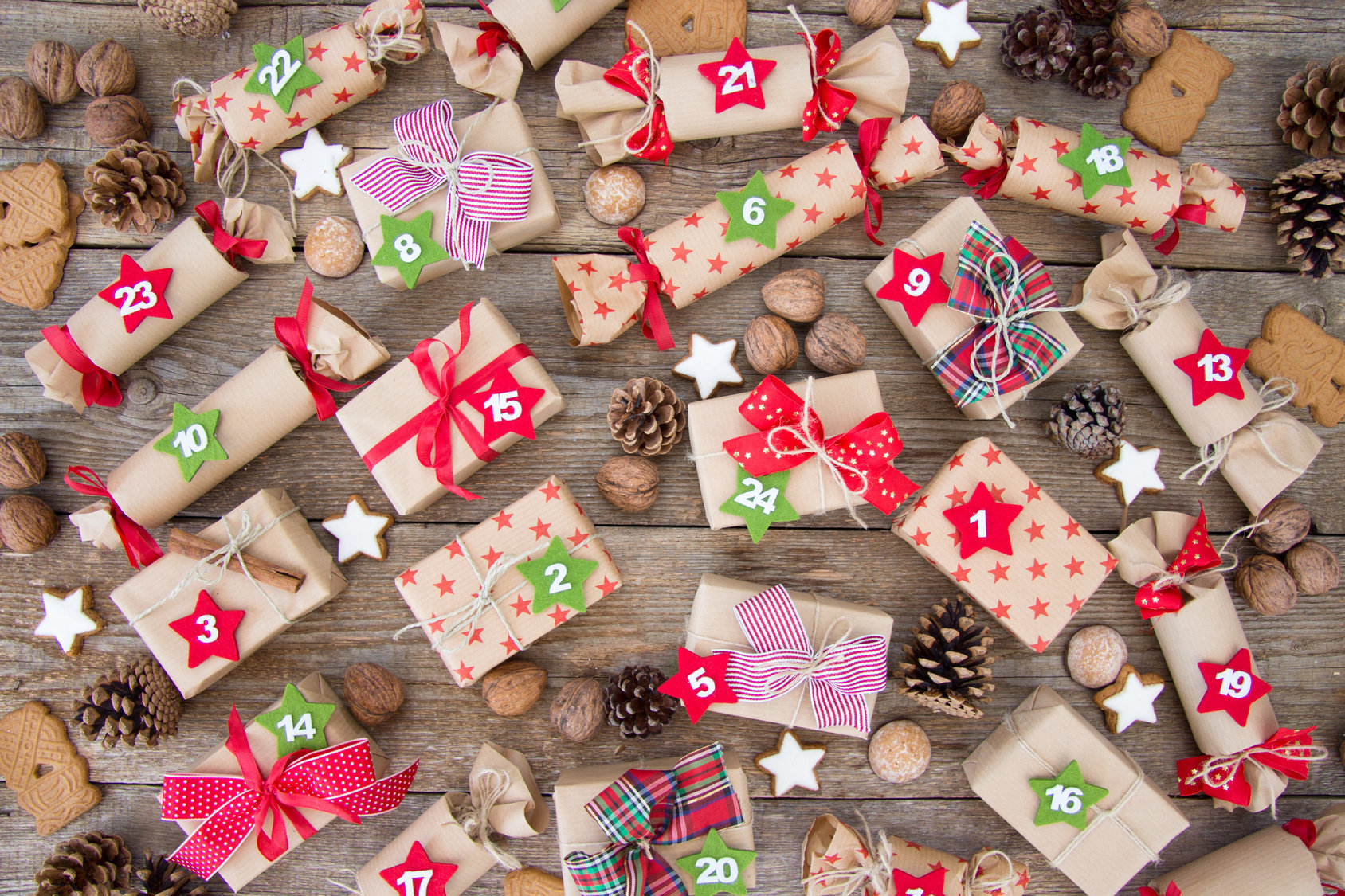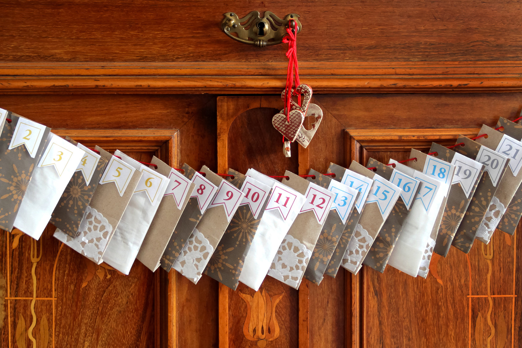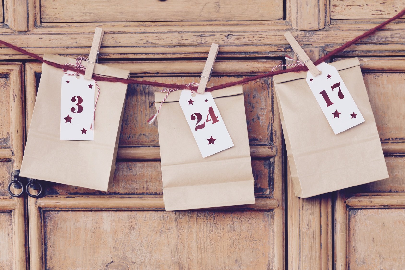 Do deski przymocuj 24 drewniane klamerki. Na klamerkach zawieś ponumerowane mini torebki papierowe. Oczywiście z drobnymi upominkami wewnątrz. Jeśli nie chcesz montować konstrukcji z deski, możesz zawiesić klamerki na sznurku lub tasiemce. Codziennie odpinamy jedną torebkę.
