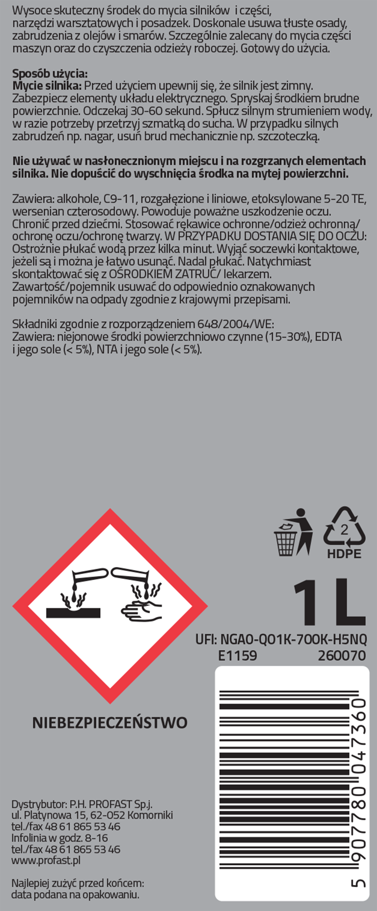 Preparat do mycia silnika z zewnątrz, elementów mechanicznych i nadwozia. Doskonale usuwa wszelkie oleje, smary i inne zanieczyszczenia ropopochodne. Nadaje się do mycia narzędzi i posadzek warsztatowych. Nie niszczy uszczelek, elementów lakierowanych i chromowanych. Super silny i skuteczny.