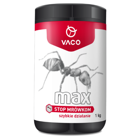 Proszek na mrówki MAX 1 kg VACO zwalcza wszystkie gatunki mrówek oraz ich gniazda. W składzie preparatu znajduje się cypermetryna oraz geraniol. Proszek na mrówki MAX można stosować na dwa sposoby — jako suchy granulat lub roztwór do oprysku dzięki bardzo dobrej rozpuszczalności proszku w wodzie. Preparatu można używać zarówno na zewnątrz, jak i wewnątrz budynku, bo zawiera składniki zniechęcające do przypadkowego spożycia przez człowieka oraz zwierzęta domowe. W jednym opakowaniu znajduje się 1 kg produktu.