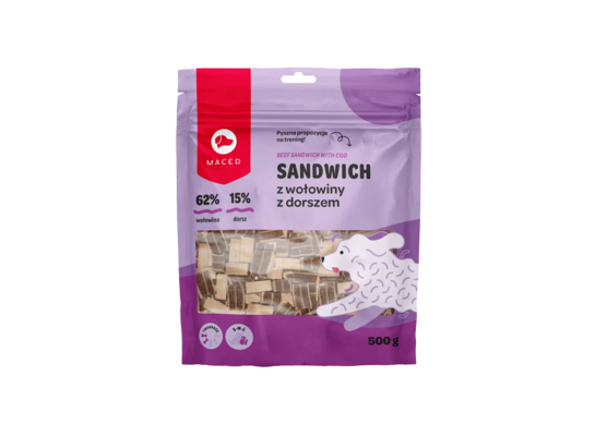 - >Przysmak dla psa sandwicz z wołowiny z dorszem 500 g Maced