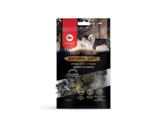 NATUREL SOFT to monoproteinowy, w 100% naturalny przysmak zawierający aż 91% mięsa wołowego, będącego jedynym źródłem białka. Miękkie i soczyste kąski pozbawione są zbóż, przez co są pełnowartościowe w każdym gramie. Dodatek oregano działa przeciwbakteryjnie, przeciwgrzybicznie, wspomaga trawienie, posiada także właściwości uspokajające. Przysmak polecany psom z alergią na białko inne niż wołowe. *100% wołowiny w części mięsnej