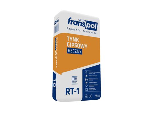 Tynk ręczny do prac wykończeniowych, idealny do tynkowania mniejszych powierzchni (prace bez użycia agregatu), polecany do tynkowania framug drzwi, okien, wypełniania ubytków ścian. Tynk Gipsowy Ręczny RT-1 przeznaczony jest do wykonywania jednowarstwowych wewnętrznych wypraw tynkarskich nakładanych sposobem ręcznym, jak również do wyrównywania i wypełniania ubytków w ścianach i tynkach. Zawiera komponenty sprawiające, że mieszanka ma wydłużony czas wiązania, jest łatwa w obróbce i odznacza się dobrą przyczepnością do podłoża. Po zarobieniu z wodą daje plastyczną, łatwo urabialną masę tynkarską o wysokiej wydajności tynkowania.