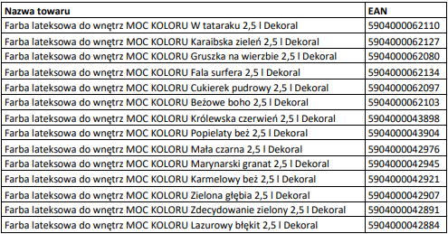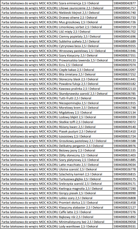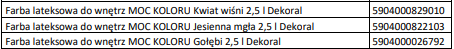 5. Promocją objęte są Farby lateksowej do wnętrz MOC KOLORU 2,5 l Dekoral z załączonej listy, dostępne w sklepie stacjonarnym Bricomarche w okresie trwania promocji.